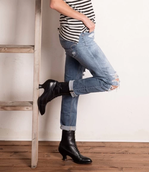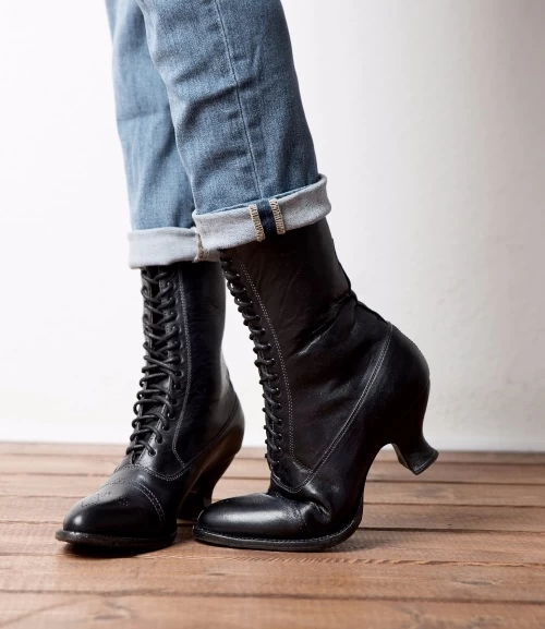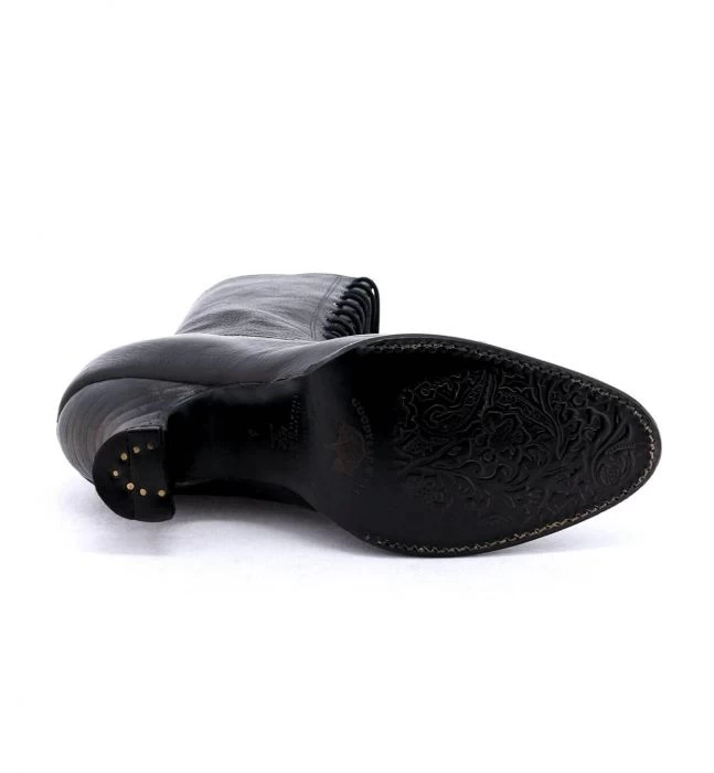 Let MIRABELLE cast her enchanting spell on you. A beautifully hand-crafted leather, Black Rustic granny style boot made with reinforced grommet front laces, and delicate toe perforation. A Tall boot made to turn heads.