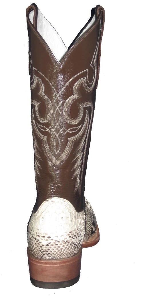 The Natural Python Backcut Fancy Stitch Cowboy Boots from the Old Trading Post Boot Corral is one of our recent most popular Exotic Hide / Skin Cowboy Boots. These Python Fancy Stitch Cowboy Boots are Handmade in El Paso Texas by our Master Boot Makers and with the invasive species problem in Florida these have become very popular. These Python Cowboy Boots are made with a 12″ Brown Leather top Shaft with Fancy Stitching, they are Leather Lined come with Comfort Insoles and Leather Outer Soles with 1 3/4″ Western Walking Heels and a Pointed Snip Toe. Python wears surprisingly well over the years with a little care and cleaning.
