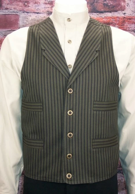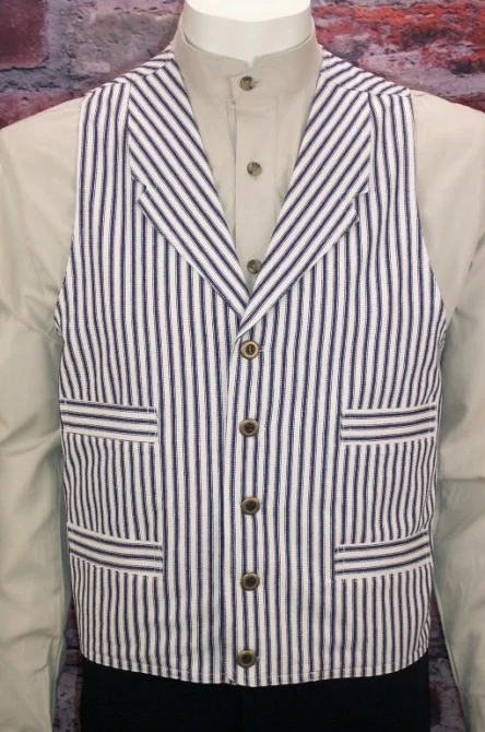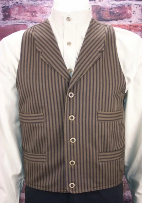 |  Bankers, townsfolk and gamblers alike would be found wearing this classic old west style stripe vest. This striped vest has four front pockets to carry all your essentials, notched lapels and an adjustable cinch back strap assuring a great comfortable fit. Fully lined. 100 % cotton. Import. Cold wash only. Available in sizing ranging from Small-3XL. |