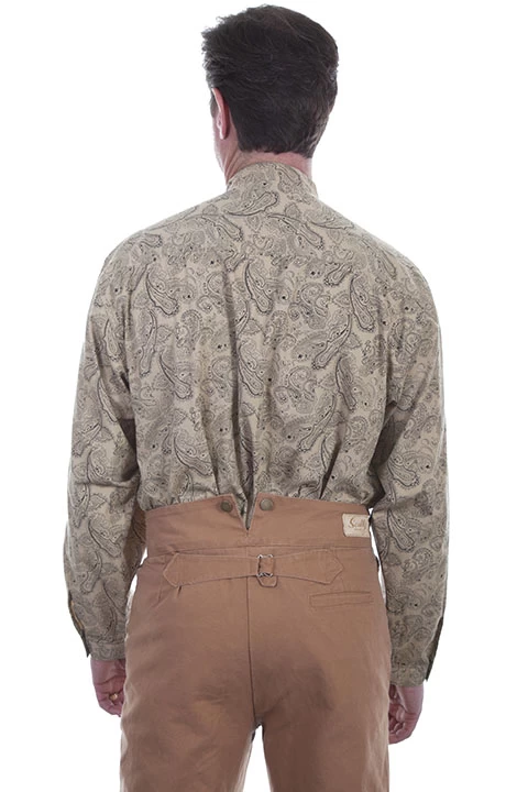 Paisley cotton shirt. This distinctive paisley shirt features a full pewter button front band collar and left chest pocket. 100% cotton. Machine wash cold and tumble dry. Import.