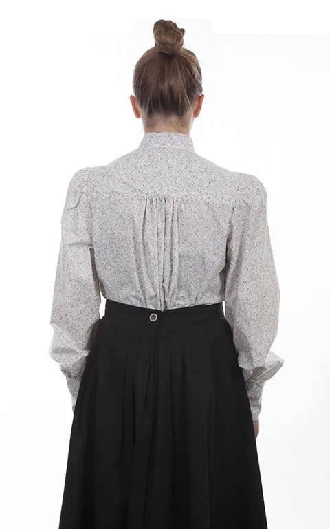 Petite rose blouse. This sweet rose print blouse features a full button front and a band collar. It has three pleated panels on the shoulders with gathered sleeves and three button cuffs. 100% cotton. Machine wash cold and tumble dry low. Made in the usa.