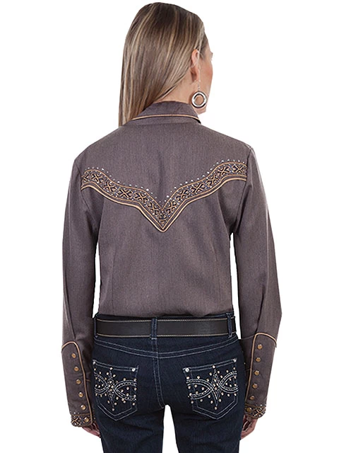 Poly/rayon blend blouse has a snap front and cuff closures. It features an embroidered decorative band and antique brass studs that run along the perimeter of the yokes and cuffs. Piping throughout. Machine wash cold and hang dry.