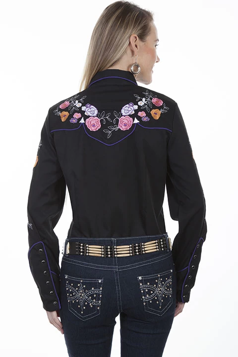 Poly/rayon blend blouse has snap front and cuffs. It features a colorful floral rose with outline white leaves and stems on front and back yokes and sleeves. Piping throughout. Machine wash cold and hang dry.