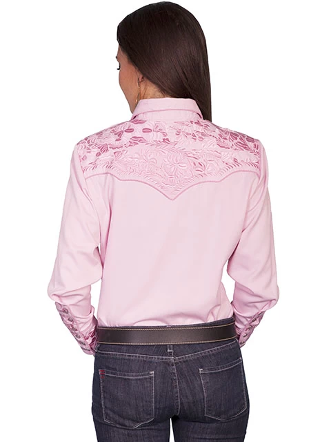 This Poly/rayon blend snap front blouse is adorned with Floral embroidery on the yokes (front/back) and sleeve. Machine wash cold hang dry. Imported.