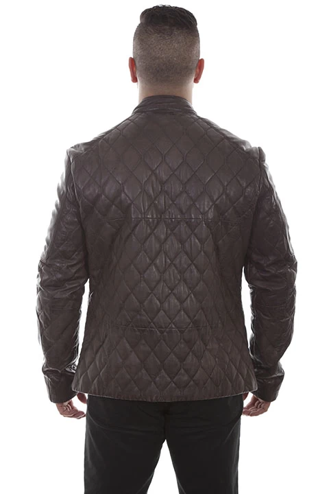 Quilted leather jacket. This amazing warm comfortable jacket features a front zip closure, band collar with snap closure and two lower vertical zip pockets. The interior is lined and has inside pockets.