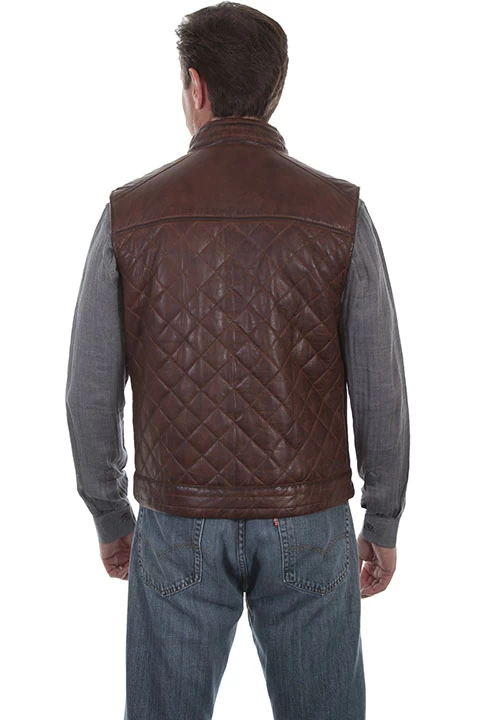 This rugged quilted vest features two large bold pockets with zip closures. It has a snap band collar and front zip closure. The lining is cotton and the back features the American Flag. It also has two inside chest pockets. Import.