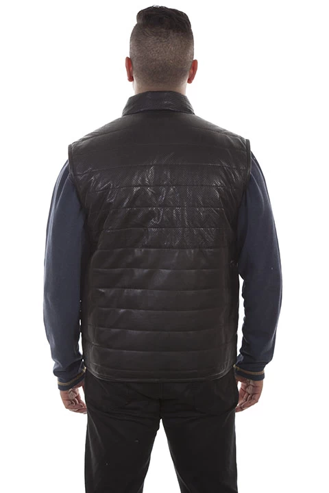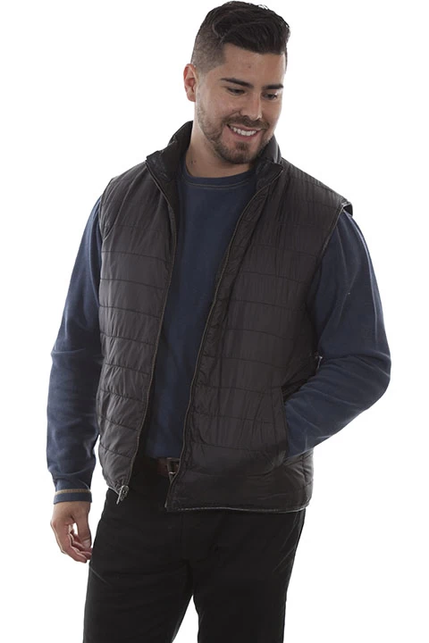 This stylish ribbed vest features a reversible side. It has a front zip closure and band collar. The two lower pockets are side entry welt pockets.