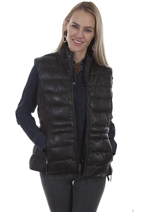 This fun and playful reversible vest gives you two vests in one!. This horizontal ribbed leather vest features a zip front closure and band collar. It has two lower vertical zip pockets. The cool reverse camouflage side is 100% polyester and also has two lower vertical zip pockets.