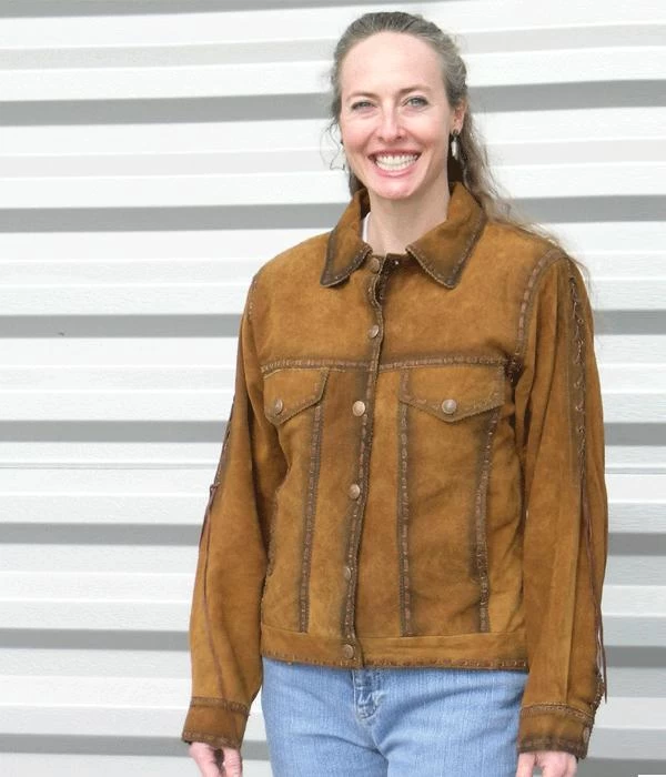 The Rusty jacket is the classic jean jacket in light weight suede leather, but with a distressed look. It is fully lined in poly-satin and has an extra inner lining pocket. One adjusting tab with 2 buttons on each side of the belt helps you adjust the belt for just the right fit at the hips. Available in leather color pictured only Rustic Tan.
