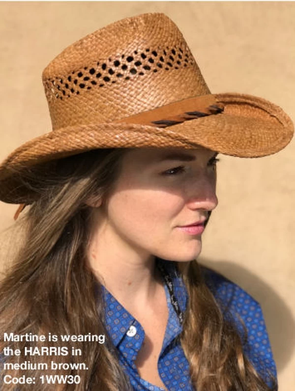 The Shady Brady Harris hat is a true western hat with a classic Leather backing band with a Multi-Colored Twisted Leather Outer Hat Band. The Harris hat pictured is shown in natural color with each hat offering special shape retention features which are designed into each style to help maintain their distinctive shape and form.