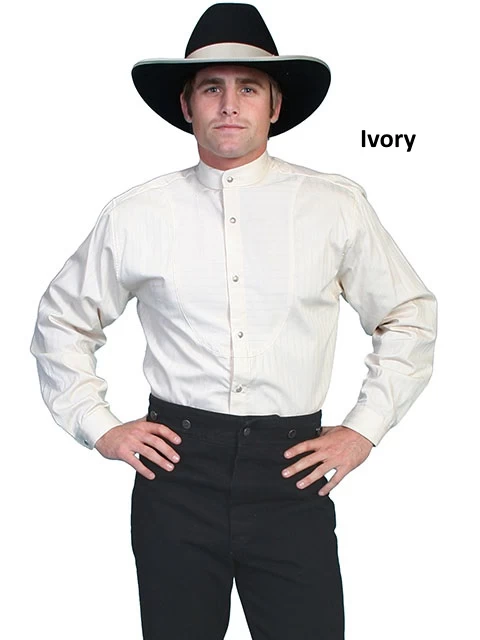 This classic style shirt features a inset bib with stamped metal buttons with beautiful tone on tone stripe design. It has a banded collar and a double pleat at the center back yoke. 100% cotton. Made in usa.