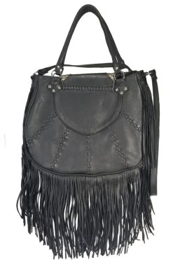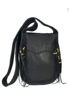 The Sioux cross body shoulder bag is made in black leather from soft full top grain leather, accentedd with sand beading on the front flap with long fringes. The flap of the Sioux leather bag is braided and has fringes in front and back and comes with a leather adjustable cross body shoulder strap. The dimensions of this bag are 10.5″ H X 11.5″ W X 2.5″ D.