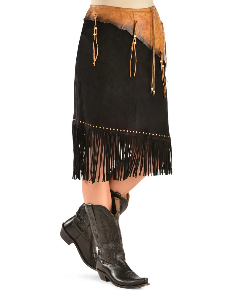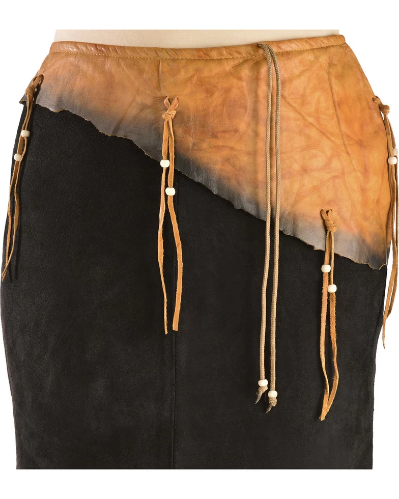 Kobler Leather is a leader in high-quality leather goods for today’s modern country girl has created a one-of-a-kind skirt that will turn heads. This is a knee length skirt in cow split suede with a tan colored cowhide belt in contrast leather. This is a wrap around skirt with woven ties passing thru the belt to tie on the left of the belt. This allows the belt size to be adjusted to allow a top to be tucked in. Contrast brass nail heads at the lower hem cut at a slant with fringes under them makes this a distinctive skirt. Available in Black Suede with a Brown Cowhide Belt as pictured only!