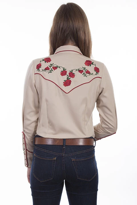All the rage this season are roses and this beautifully embroidered rose shirt shouts out that sentiment!. This Poly/rayon blend shirt has a snap front and cuff closures. Red rose embroidery on front, back yoke and cuffs with red piping throughout and front smile pockets. Machine wash cold and hang dry.