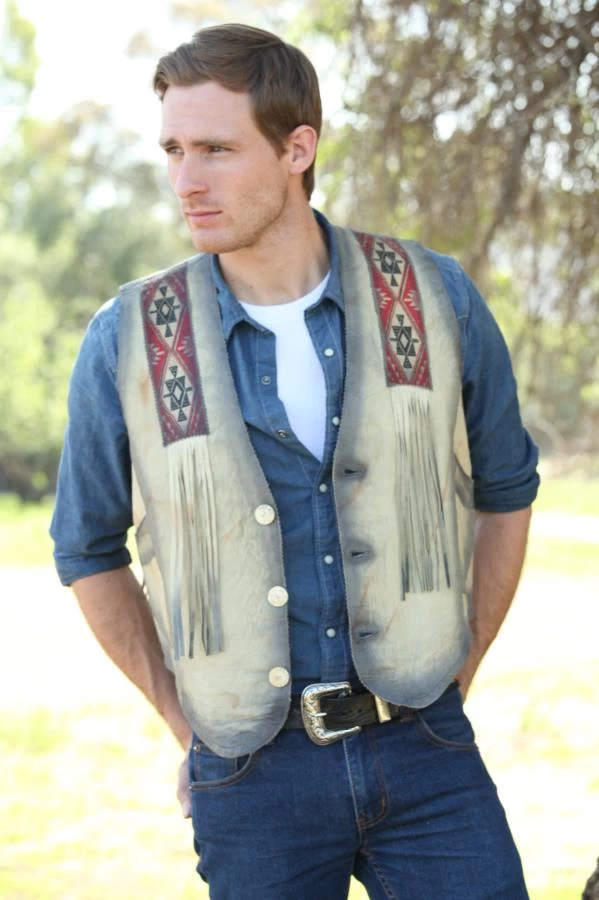 This beautiful vest is made from very soft cowhide leather. The back of this vest has an Indian print the front is adorned with matching southwestern artwork and bone buttons for closure. It is a unisex design to be worn by men and ladies. The garment is lined with poly-satin and has 2 front pockets.