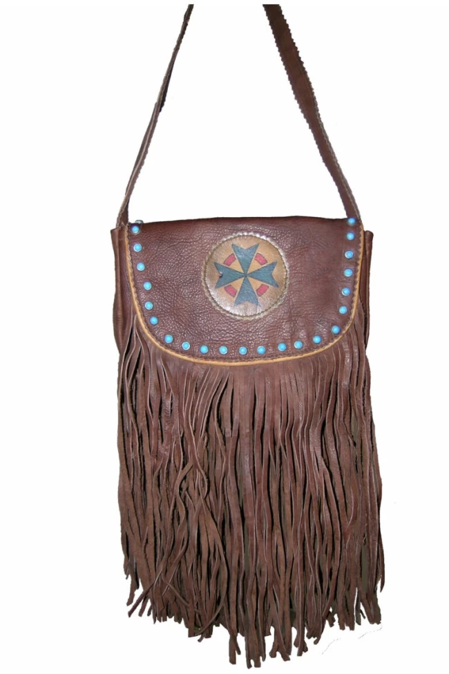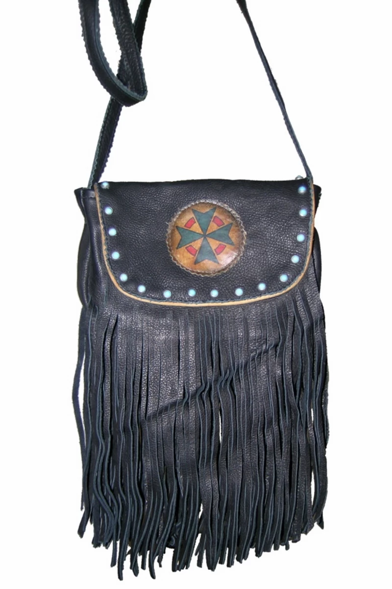 The Stone bag is made of a soft full top grain leather. It’s the perfect medium size leather bag complete with a cross body leather shoulder strap. Featuring a Southwestern motif, rosette in front and spots around the front flap finished off nicely with hand cut leather fringes at the base. The dimensions of this medium size leather bag are 5″ H X 8.5″ W X 1.75″ D. Available in your choice of 3 colors Black, Brown or Tan.