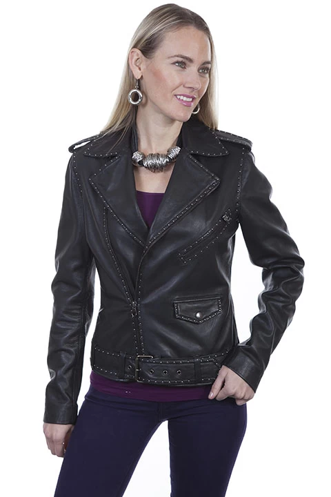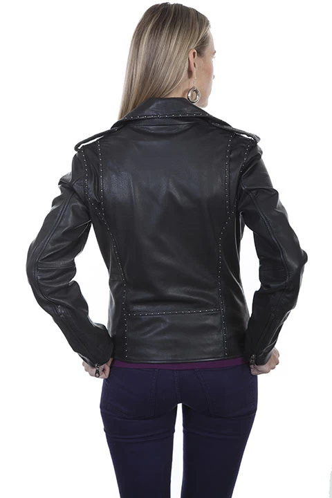 This stunning motorcycle jacket features nickel studs throughout. It has an asymmetric zip front closure with a diagonal chest zip pocket and lower left flap pocket with a snap closure and zip closing cuffs. 100% polyester lining.