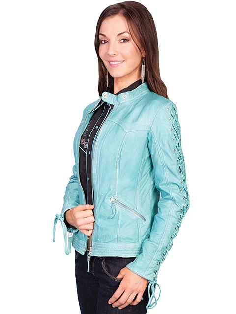 The focal point of this jacket is the lacing on the sleeves accented with nickel studs. The fine tailoring on this jacket has single point front and back yokes standup snap collar and a ribbed waist band. It has a zip front closure and two diagonal zip front pockets. Fully lined.