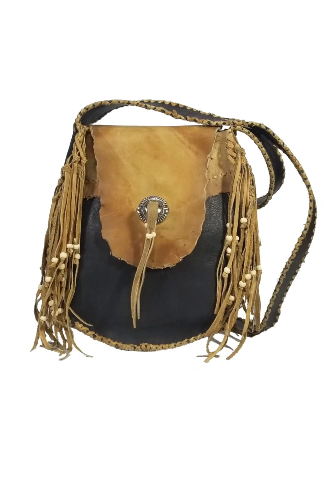 Based on the design of the old west saddle bags. This is a fully laced leather constructed bag with fringe. It comes in a two color combination of black and tan. Hand laced in a contrast color on all edges and on the wide cross body strap. It has natural rough cut front flap with an added concho and bone beads . Keeping in the spirit It has the feel and look of the rugged old west. This combination bag in made of soft full top grain leather with an antique looking bi color. The dimensions of this combo bag are 10″ H X 9.5″ W X 2.5″ D.