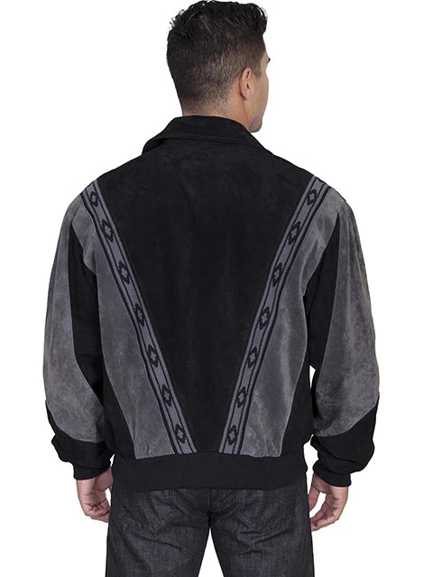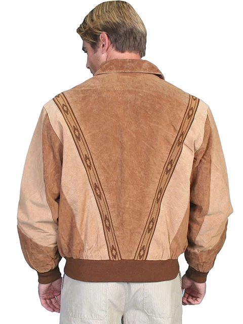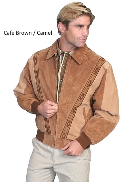 This Two-toned boar suede rodeo jacket has a Southwestern motif with knit trim waist and cuffs. Zip front with two lower diagonal side entry welt pockets. Acetate lining with two inside chest pockets.