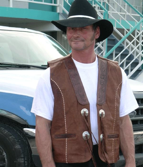 Leather vest with hand tooled collar and back yoke. It is lined with polysatin and has an inner lining pocket. Silver colored conchos with ties accentuate the front. Also notice the leather carving on front pockets.