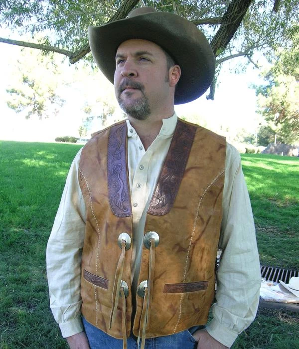 Leather vest with hand tooled collar and back yoke. It is lined with polysatin and has an inner lining pocket. Silver colored conchos with ties accentuate the front. Also notice the leather carving on front pockets.