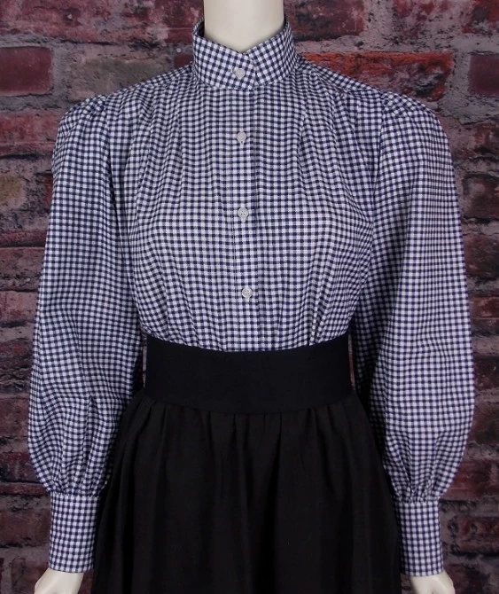 Classic old west ladies plaid cotton blouse features elegant puff style sleeves and a button down front. Perfect for pioneer or old frontier days, western reenactments and theatrical productions. Available in blue plaid, gold plaid. or red plaid colors and in sizes Small – 3XL.