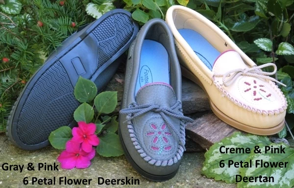 Footwear by Footskins created this moccasin shoe for those looking for a unique and comfortable shoe, the Women’s Flower Toe style. These Flower Toe moccasin shoes offer decorative floral designs inset with contrasting leather and hand-stitched detailing. We use a double layer of soft leather on the uppers and flexible, slip-resistant TPR rubber soles. As with all of our footwear, this style is resole-able. Contoured SorboAir® insoles add extra comfort to this style. Available in both deerskin and deertan leathers.