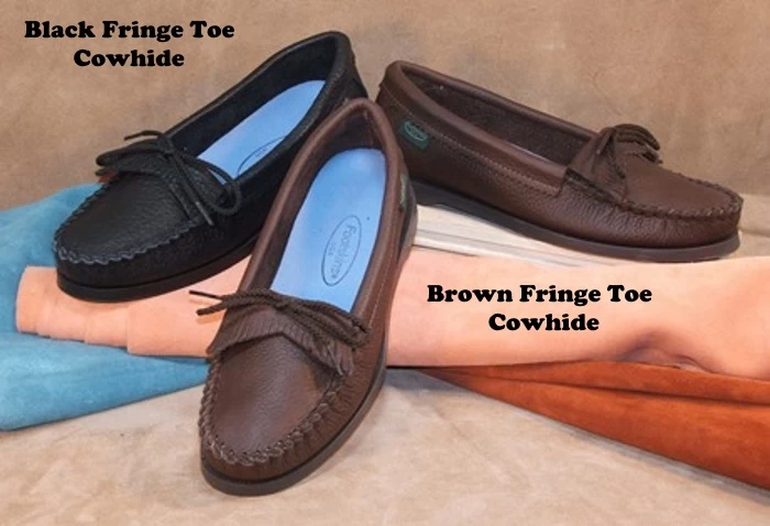 This customer favorite, our Women’s Slip-On Moccasins Shoes feature SorboAir® insoles which add cushion and arch support to the comfort of moccasin styling and the cowhide version now has a fringe on the toe. These slip-on shoes are made from tumbled cowhide and cowhide leather is firmer for more support.