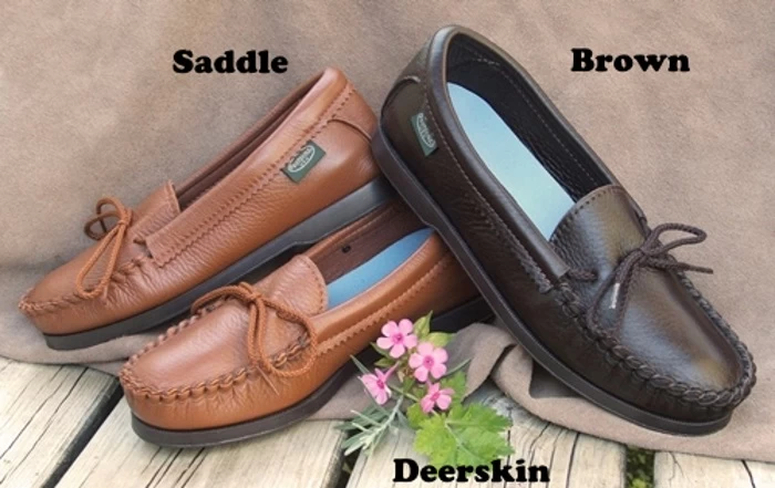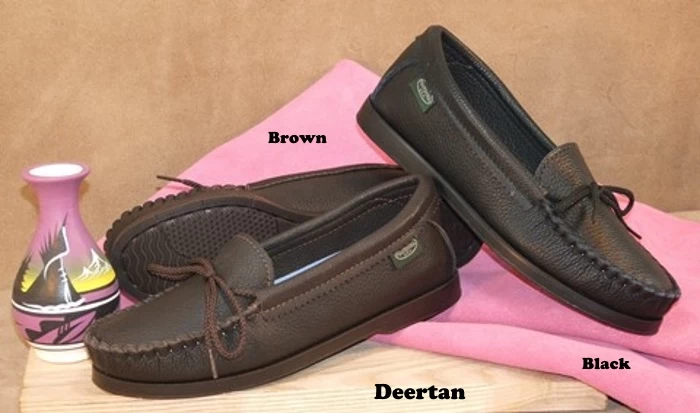 As with all of our footwear, this style of moccasin shoe is resoleable. These Slip on Moccasin Shoes are made with soft double layer deerskin leather or deertan leather, both of which readily conform to the foot for a comfortable fit.
