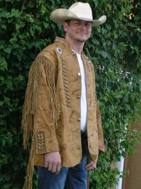 The Zapata Coat is a rough cut thigh length leather coat with bone hair-pipe and hand woven beading work accents. All of the seams of this coat are hand laced whip stitch and this Zapata Coat is fully lined in a poly-satin with one inner chest pocket. The buttons are silver colored brass, with the Southwestern Hopi Indian Kokopelli design. The Zapata Coat is available in Cream and Tan leather colors to satisfy your individual taste.